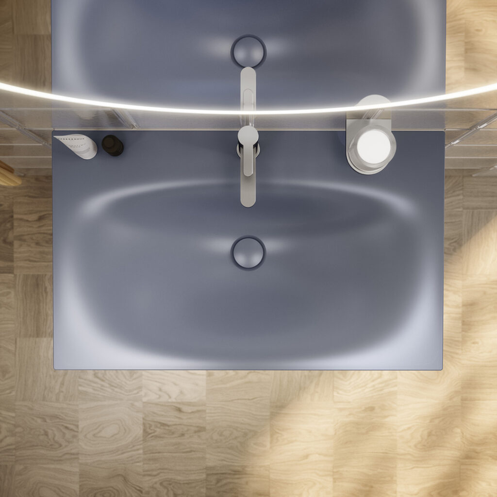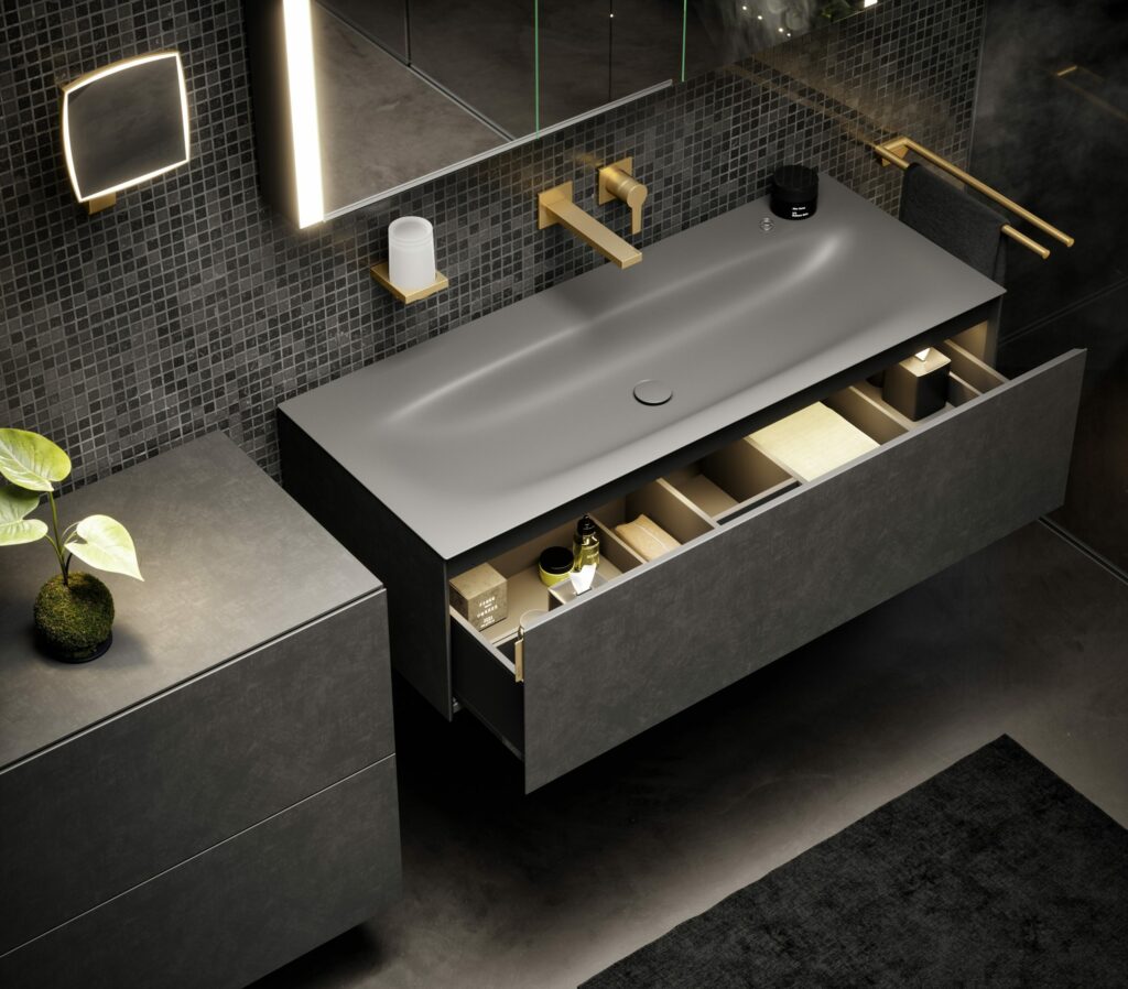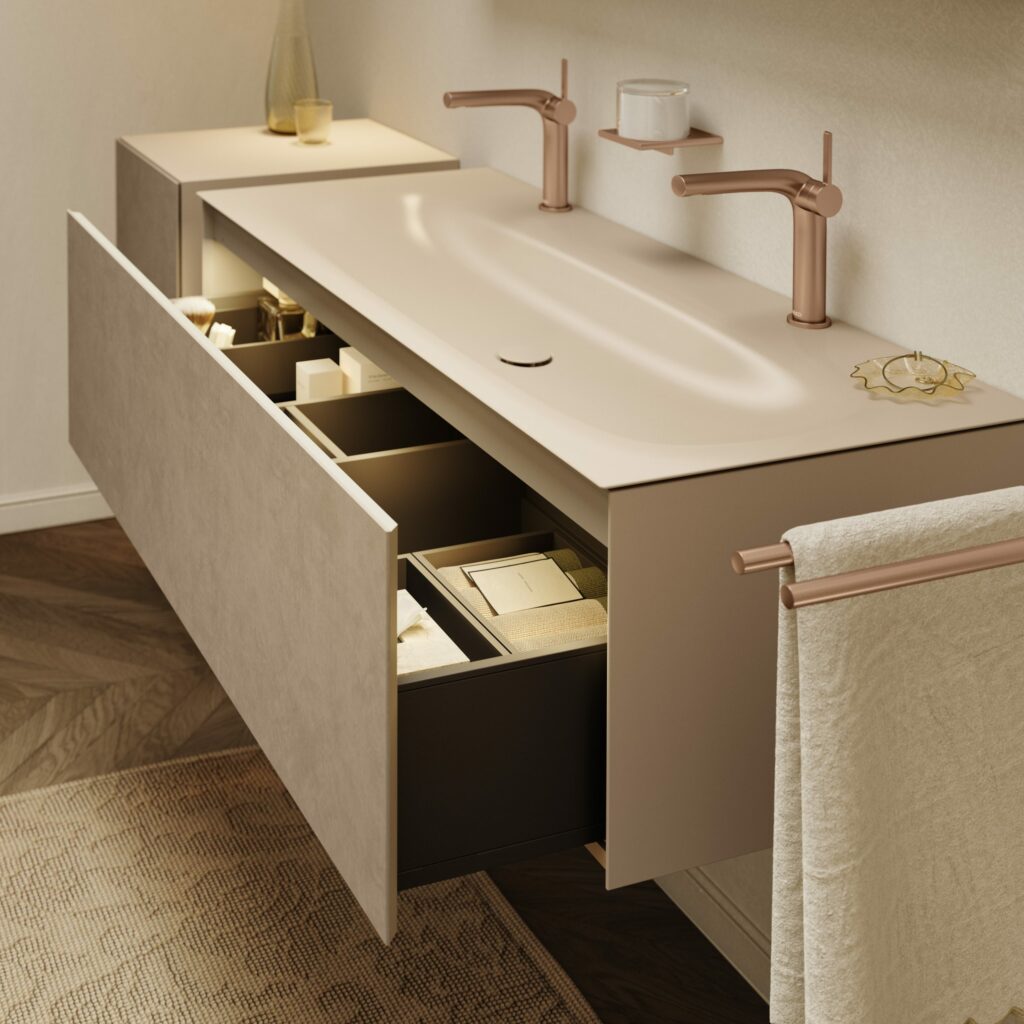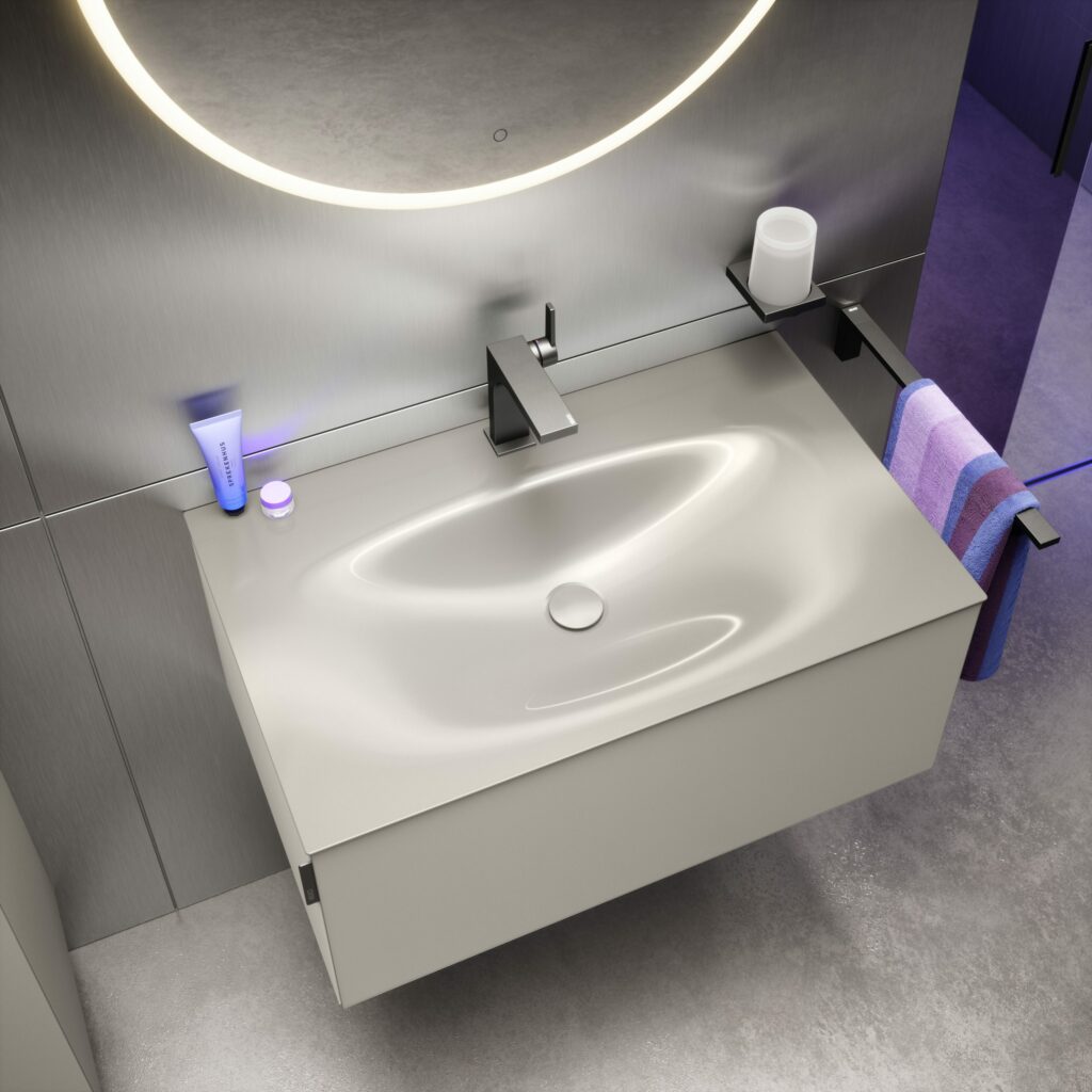 Als Einzel- oder Doppelwaschtischlösungen können so einzigartige Badwelten geschaffen werden. Für ausreichend Stauraum sorgen Breiten von 800 mm und 1200 mm, wahlweise mit ein oder zwei Schubladen. Die filigranen Kanten des Emaille-Waschtisches von extrem schlanken 4 mm verschmelzen optisch mit dem Waschtischunterbau und sorgen für eine monolithische Anmutung, bei der Möbel und Waschtisch wie aus einem Guss wirken. Neben dem samtigen, seidenmatten Lack sind die edlen Möbeloberflächen in verschiedenen hochwertigen Materialien wie Furnier, Keramik und Glas verfügbar – letztere beiden sind ebenfalls perfekt auf die Farben der Waschtische abgestimmt, um die Homogenität des Designs zu gewährleisten.